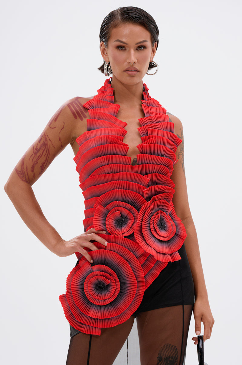 Got me hoping you'll page me right now in The AWNIS Label Crazy in Love Blouse. This unique top is crafted from sleek. structured fabric in a romantic red ombre colorway. It features a plunging halter neckline with a button closure. an asymmetrical hem. and three-dimensional pleated rosettes that spiral across the body to result in a striking. avant-garde silhouette. Complete with soft inner lining and a back zipper closure.