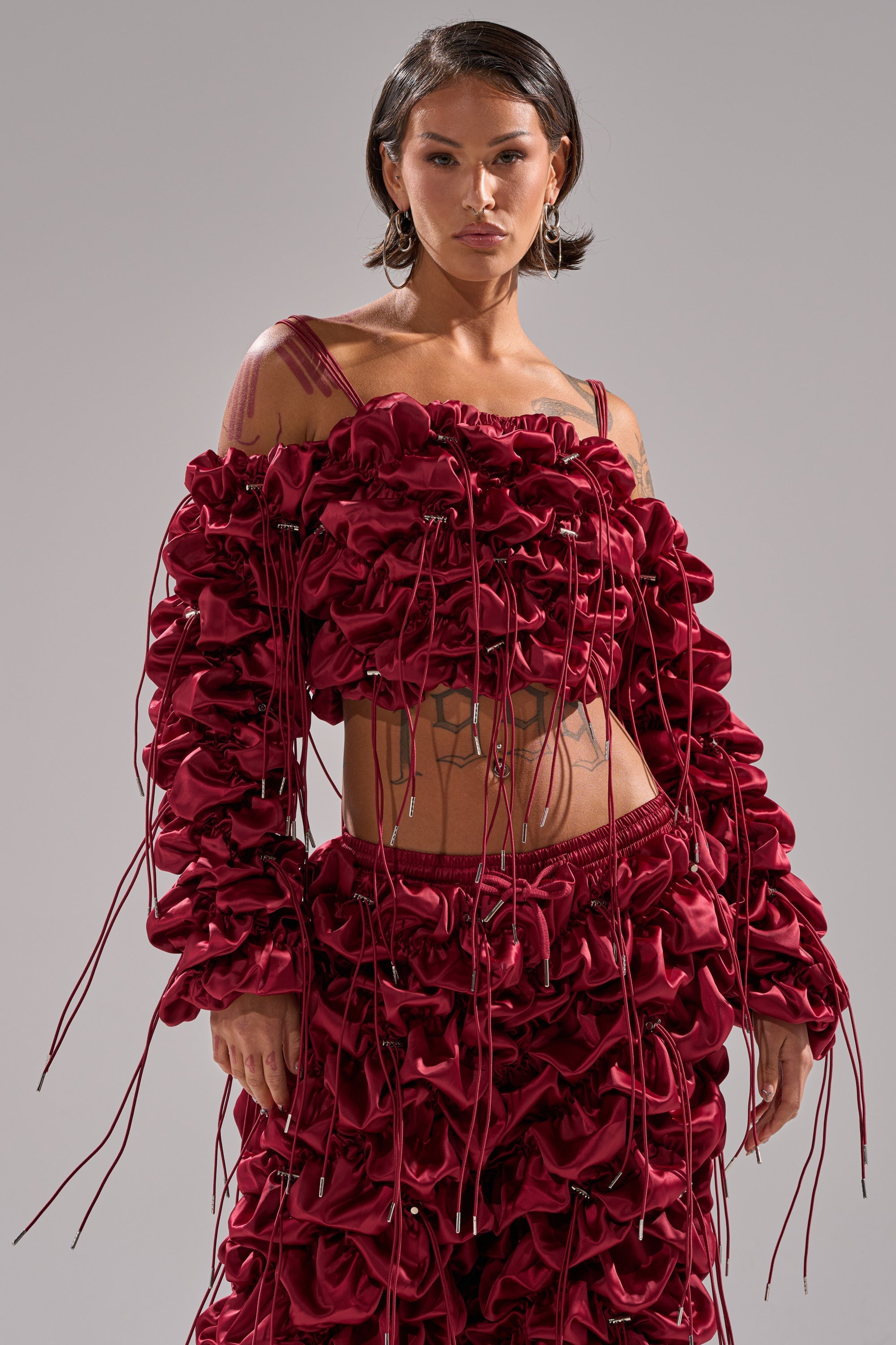 Won't you take me to Funkytown? The AKIRA Label Feeling Funky Tie Blouse delivers sculptural volume with its ruched satin construction and adjustable drawstring detailing throughout. Designed in a rich burgundy hue. this off-the-shoulder silhouette features delicate bungee shoulder straps and cascading ties with silver-tone hardware that create a dynamic. textural effect. A metallic back zipper closure ensures a secure fit while maintaining a sleek finish. Style with the matching Feeling Funky Wide-Leg Jogger to make a showstopping statement.