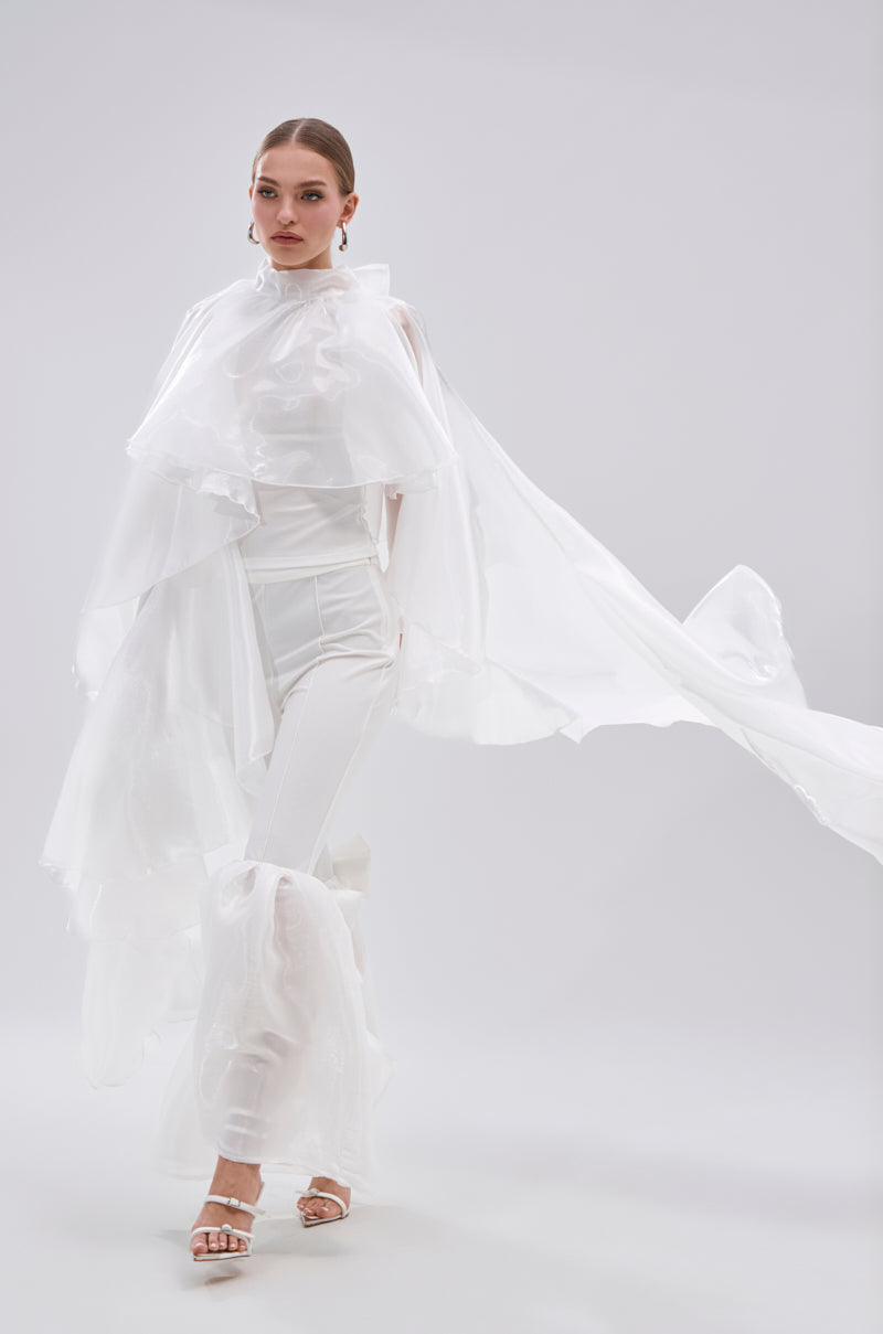 There's always a reason to celebrate in The AWNIS Label Jump Around Blouse. This stunning top is crafted from a sheer. lightweight satin base and features a mock neckline. a self-tie ribbon closure at the back of the neck. and a dramatic tiered ruffle construction with cascading side pieces that skim the ankles. Complete with an attached stretchy inner cropped tank. Pair with flowy trousers. stilettos. and a bold lip for a ravishing finish.
