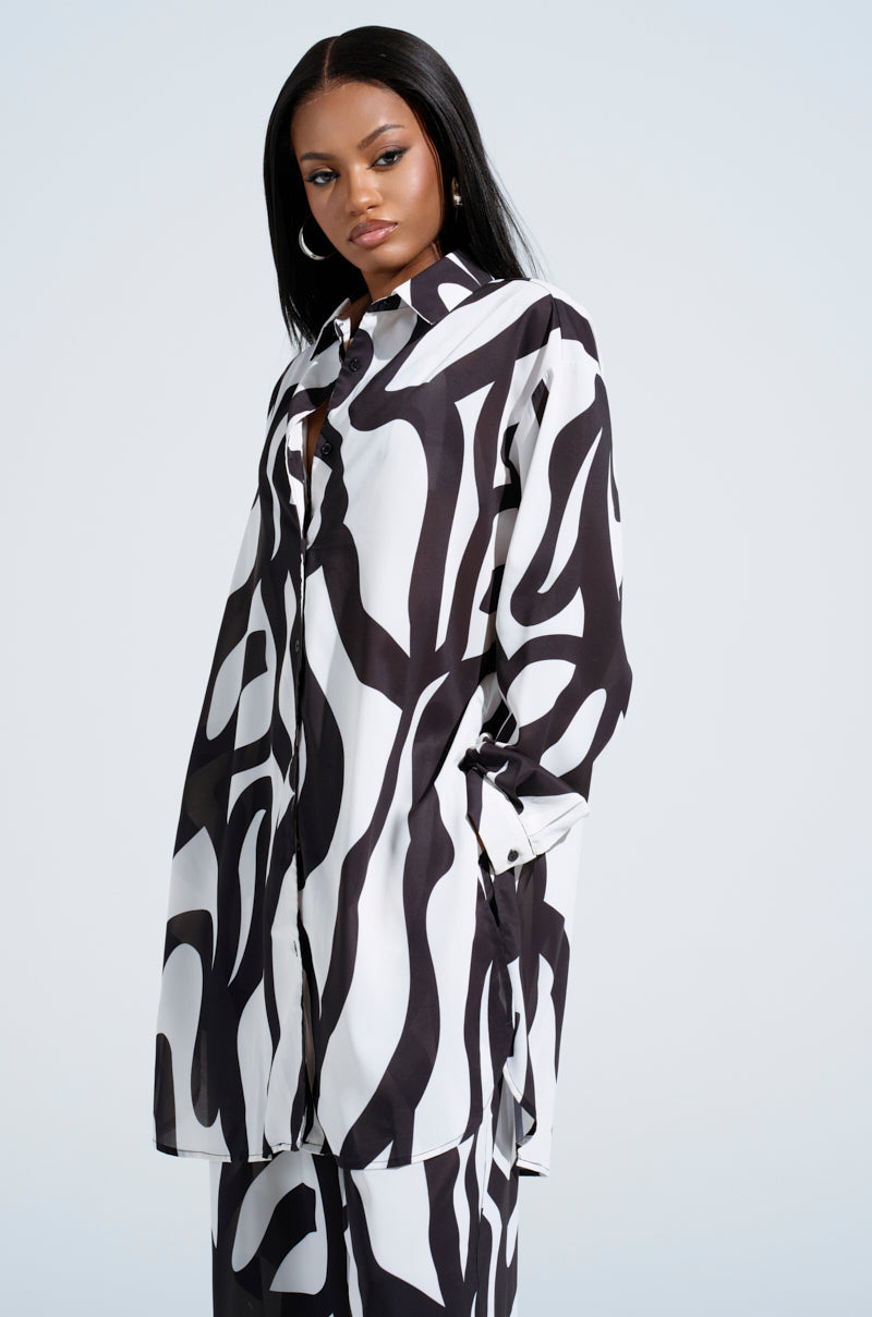 All your worries will melt away with The AWNIS Label Let It Go Button Down Top. This easy breezy blouse is crafted from a lightweight fabric with a bold. abstract swirl pattern. It features a pointed collar. long sleeves with button cuffs. coordinating button down front closures. and a relaxed longline silhouette. Style it with the coordinating AWNIS Label Let It Go Pant. Let It Go Bralette. and stiletto pumps for a finished look.