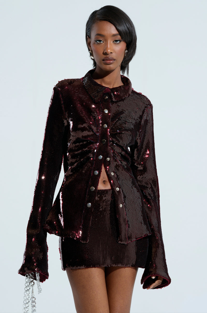 After hours kinda vibes in The AWNIS Label Lights Out Button Down Blouse. This glitzy. holiday-esque top is crafted from a double-lined. stretchy mesh base and features a pointed collar. long sleeves with slits at the bottom hems. flattering ruched detailing at the center of the bodice for a cinched look. metallic snap-button front closures. and a silky inner lining. Complete with a fitted. longline silhouette. Pair with the matching AWNIS Label Lights Out Mini Skirt. sheer tights. and stilettos for a sultry. festive look.