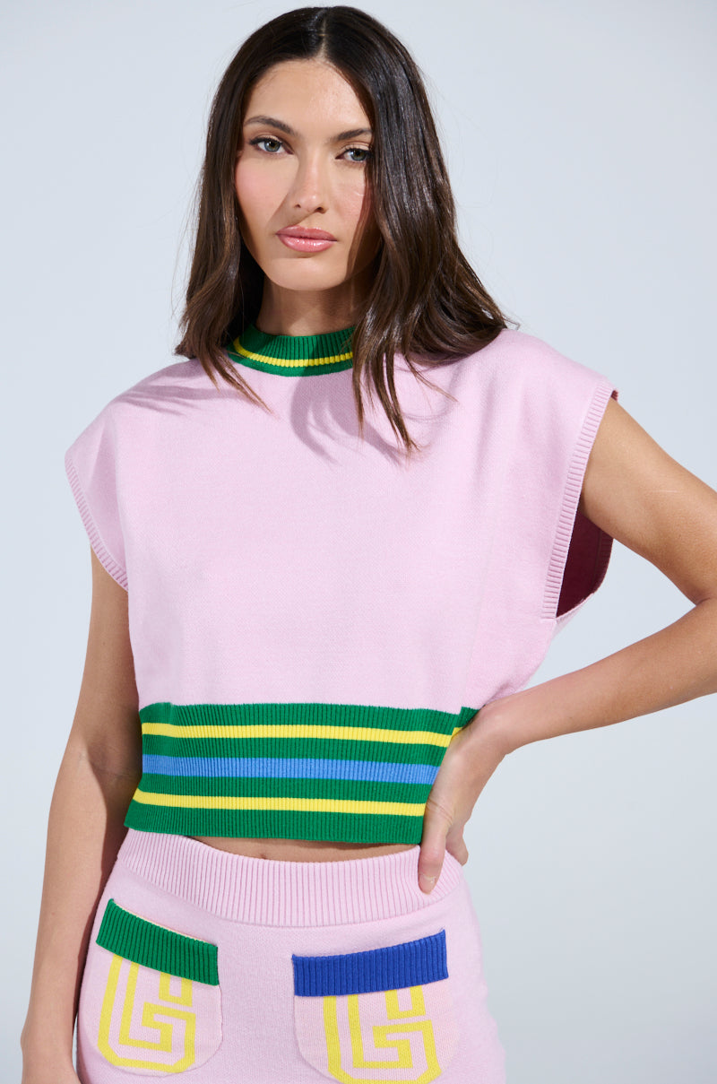 The costume department from Challengers called; they want The AWNIS Label Love Wins Sweater back. This preppy piece is crafted from an irresistibly soft knit fabrication and features an oversized. cropped silhouette. a sleeveless design. a ribbed crew neckline with athletic accent stripes. and a ribbed. cinched hem with coordinating accent stripes. Style it with the Love Wins Mini Skirt and fresh sneakers for a sporty-chic ensemble.