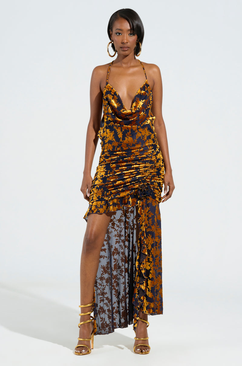 Go all in with The AKIRA Label Loved You So Much Mini Dress. This stunning piece is crafted from a stretchy velvet fabrication and features a contrast floral pattern throughout. thin tank straps that cross cross in the back. a sexy exposed backside. a cowl neckline. a sleeveless design. a flattering ruched construction throughout. ruffle detailing on the bottom hem with a coordinating flower decal on one side. and a matching cascading fabric overlay with ruffle trim. Complete with a sleek inner lining. a mini length. and an easy. slip-on fit. Pair with stiletto pumps. a vampy lip. and a clutch for a finished look.