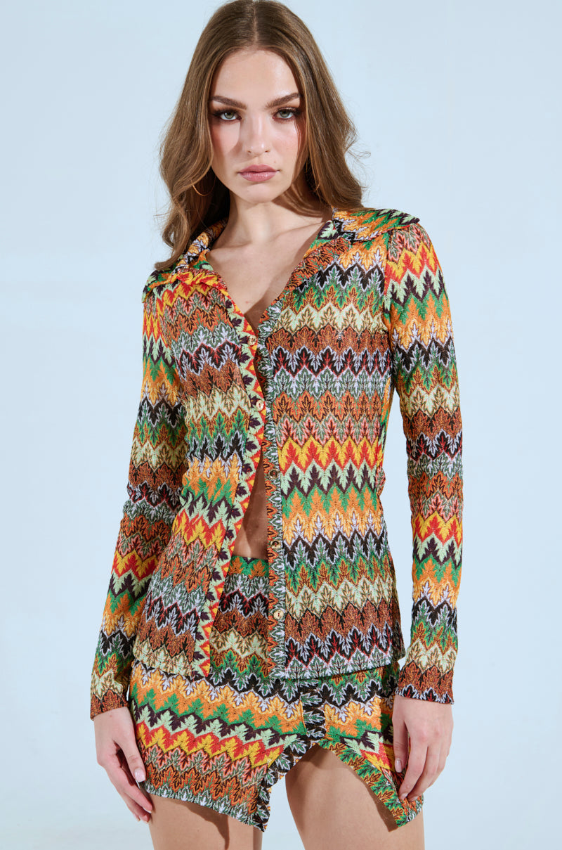 Feelin' groovy? Try on The AWNIS Label Mixed Emotions Button Down. This bold blouse is crafted from a semi-stretchy knit fabrication in a lush. 70's-inspired pattern and colorway. It is unlined and features a slim. curve-skimming fit. a pointed fold-over collar. long sleeves. and a button-down front placket with gleaming gold buttons. Style it with the complementary Mixed Emotions Mini Skirt for a chic and psychedelic ensemble.