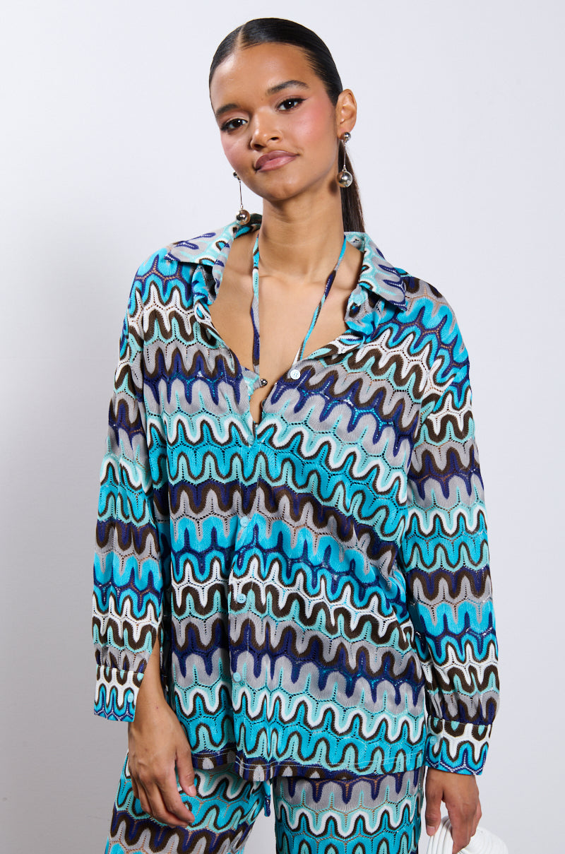 The AWNIS Label Not About It Button Down Blouse is crafted from an unlined. slightly stretchy open-weave knit fabrication and features an abstract retro inspired multicolor wave print. a fold-over point collar. long sleeves with button cuffs. tonal stitching. a button down front closure. and a relaxed. longline silhouette. Style with the coordinating AWNIS Label Not About It Bralette and AWNIS Label Not About It Trouser for a vacay-ready ensemble.