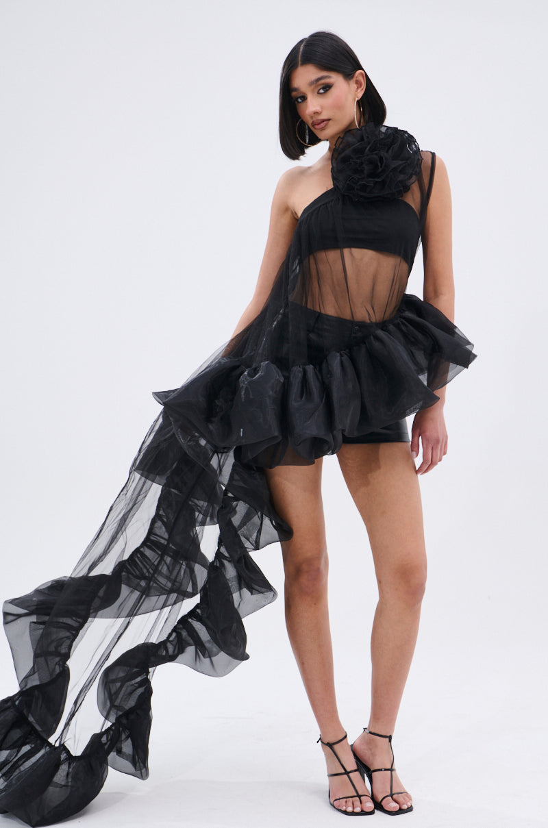 Bloom boldly in The AWNIS Label Rose Petal Lover Blouse. Crafted from sheer tulle with dramatic ruffle detailing. this one-shoulder blouse features a sculptural oversized rose appliqué at the shoulder. a layered ruffle high-low hem that leads into a cascading train. and a peplum silhouette. Complete with a concealed side zipper closure. Equal parts art and fashion. this top is your go-to for editorial shoots. high-glam moments. or unapologetic fashion statements. Shown undergarments not included.