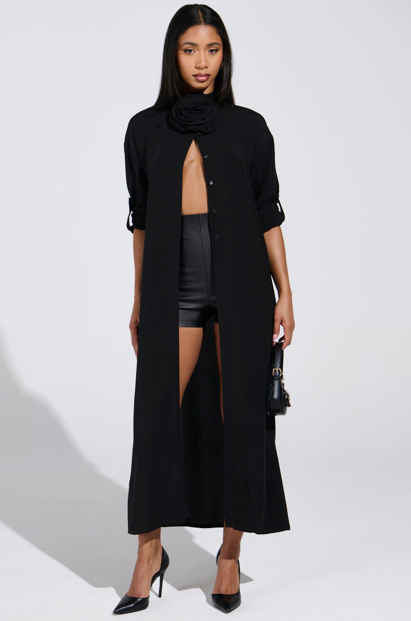 Intrigue with every thread. The AWNIS Label Tell Me More Blouse is a ravishing piece crafted from sleek material featuring a standing collar with an oversized. tonal floral applique at the base of the neck. dual button closures on the nape of the neck. quarter-length sleeves with button cuffs. mock button front closures. and an open slit front. Complete with a flowing. longline silhouette. Pair with leather shorts. stiletto pumps. and chunky hoop earrings for a finished look.