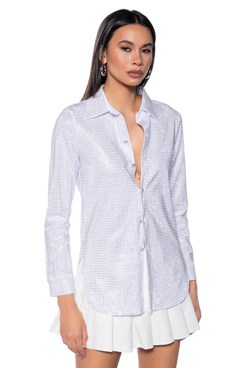 Hold me closer. tiny dancer! The AWNIS Label Tiny Dancer Rhinestone Blouse is made from a semi-stretchy cotton blend base fabrication finely decorated with glittering silver rhinestone embellishments throughout. This sultry top features a pointed collar. long sleeves with split cuffs secured by gemstone-embellished buttons. a waist length silhouette with side seam slits. and a gemstone-embellished button up front closure. Style with light wash denim jeans and pair with white pumps to finish off your glam look.