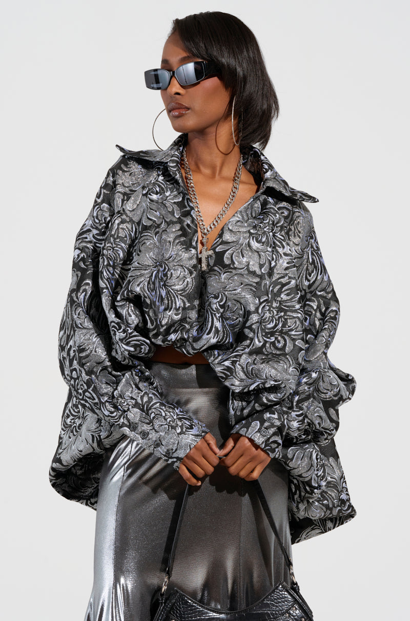 Show off your true colors in The AWNIS Label Who We Are Blouse. This gorgeous top is crafted from a double-lined knit base and features a bold. metallic brocade pattern throughout. a pointed collar. subtle long blouson sleeves with button cuffs. and an elasticized bottom hem with ruched detailing. Complete with a silky inner lining. a relaxed. longline high-low silhouette. and an easy. pull-on fit. Pair with flared velvet trousers. platform pumps. and a bold lip for a finished look.