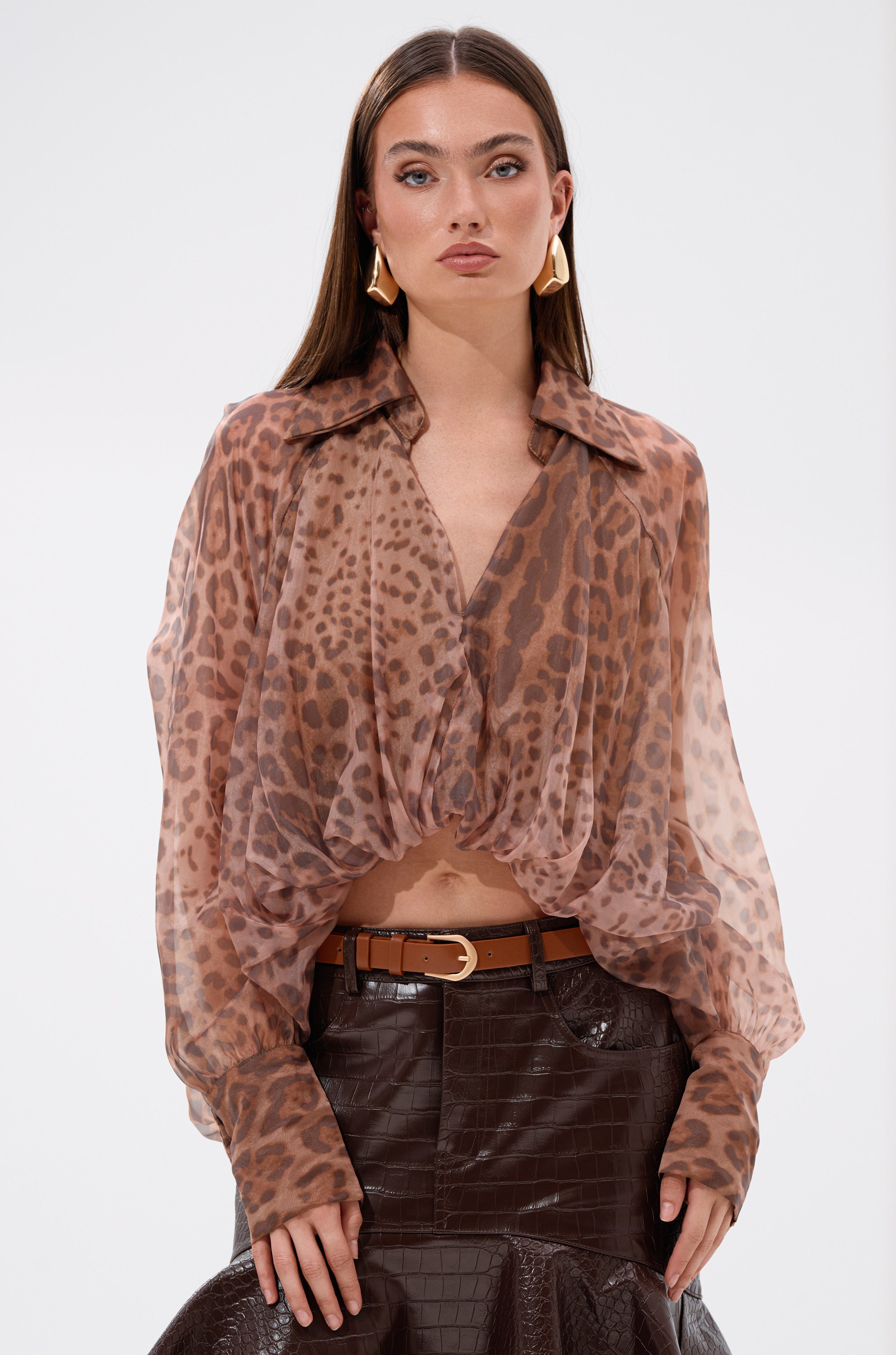 For those who prefer to live wild and free. there's The AWNIS Label Wild Spirit High-Low Sheer Blouse. Crafted from lightweight chiffon. this chic piece features classic cheetah print. a plunging V-neckline. pointed collar. long balloon sleeves with buttoned cuffs. and an asymmetrical. high-low bubble hem. Complete with sleek inner lining and a pull-on fit.